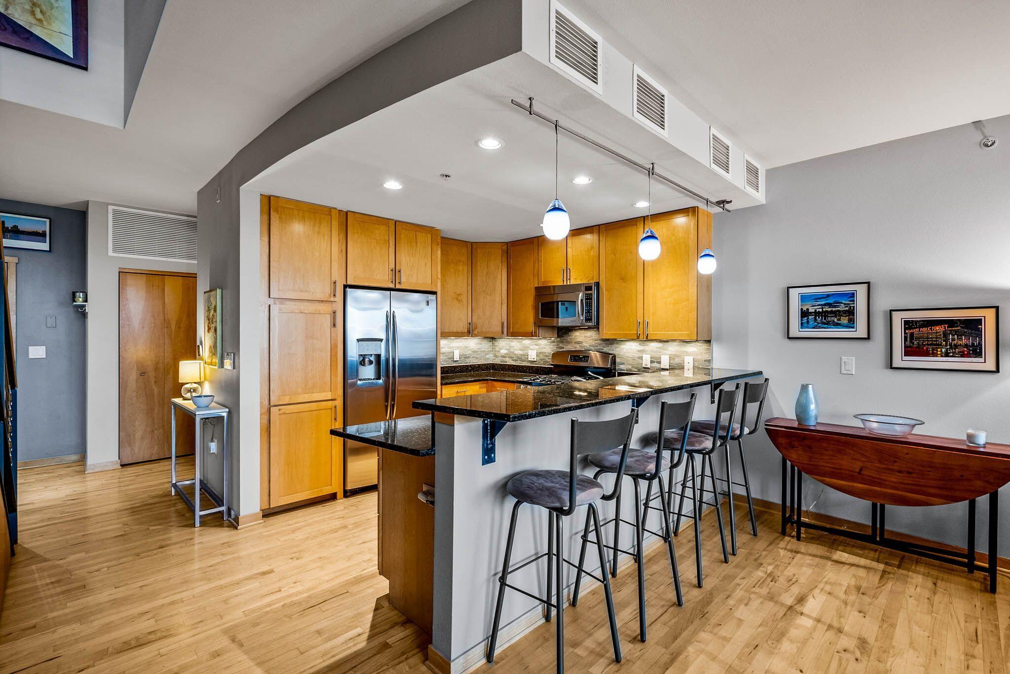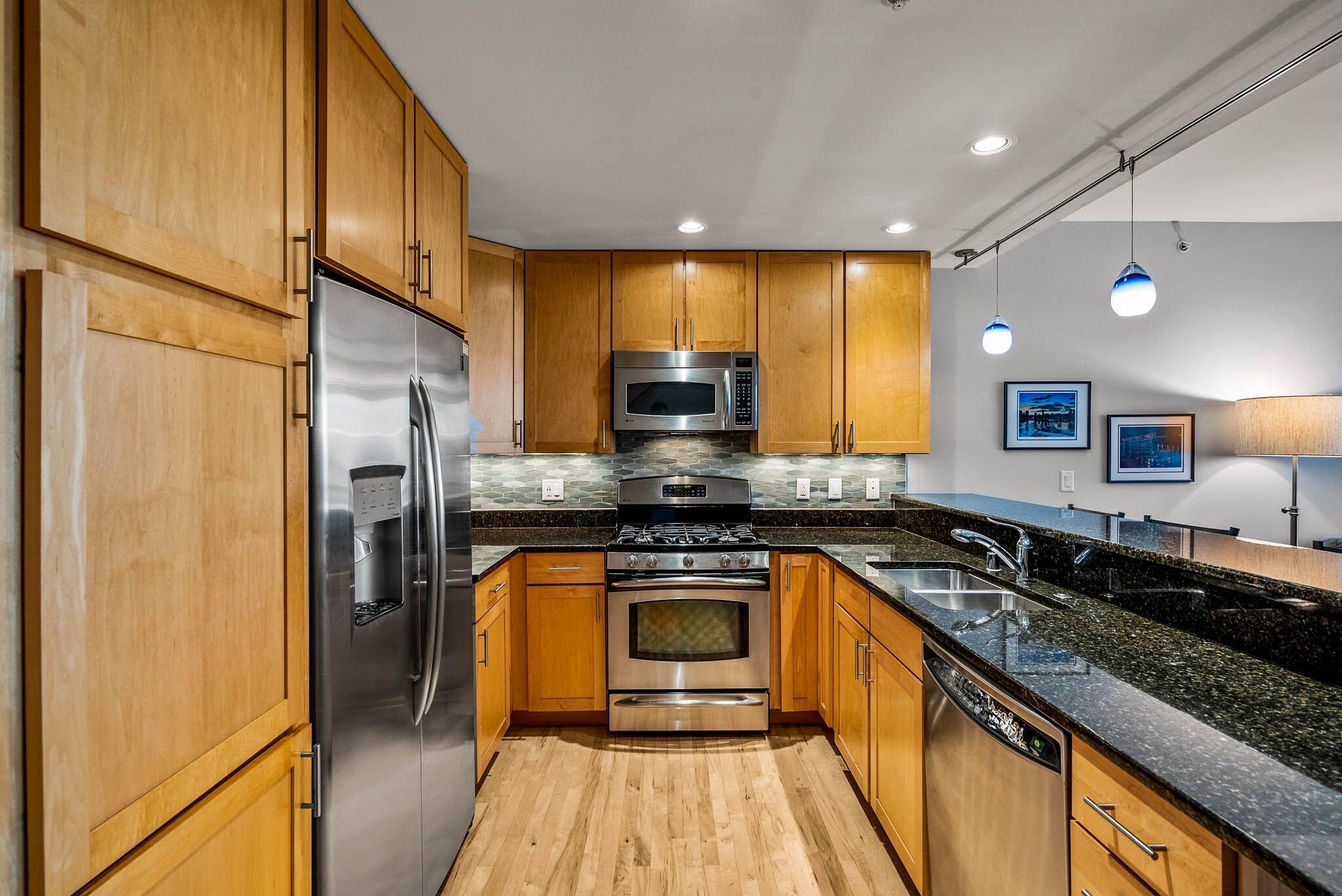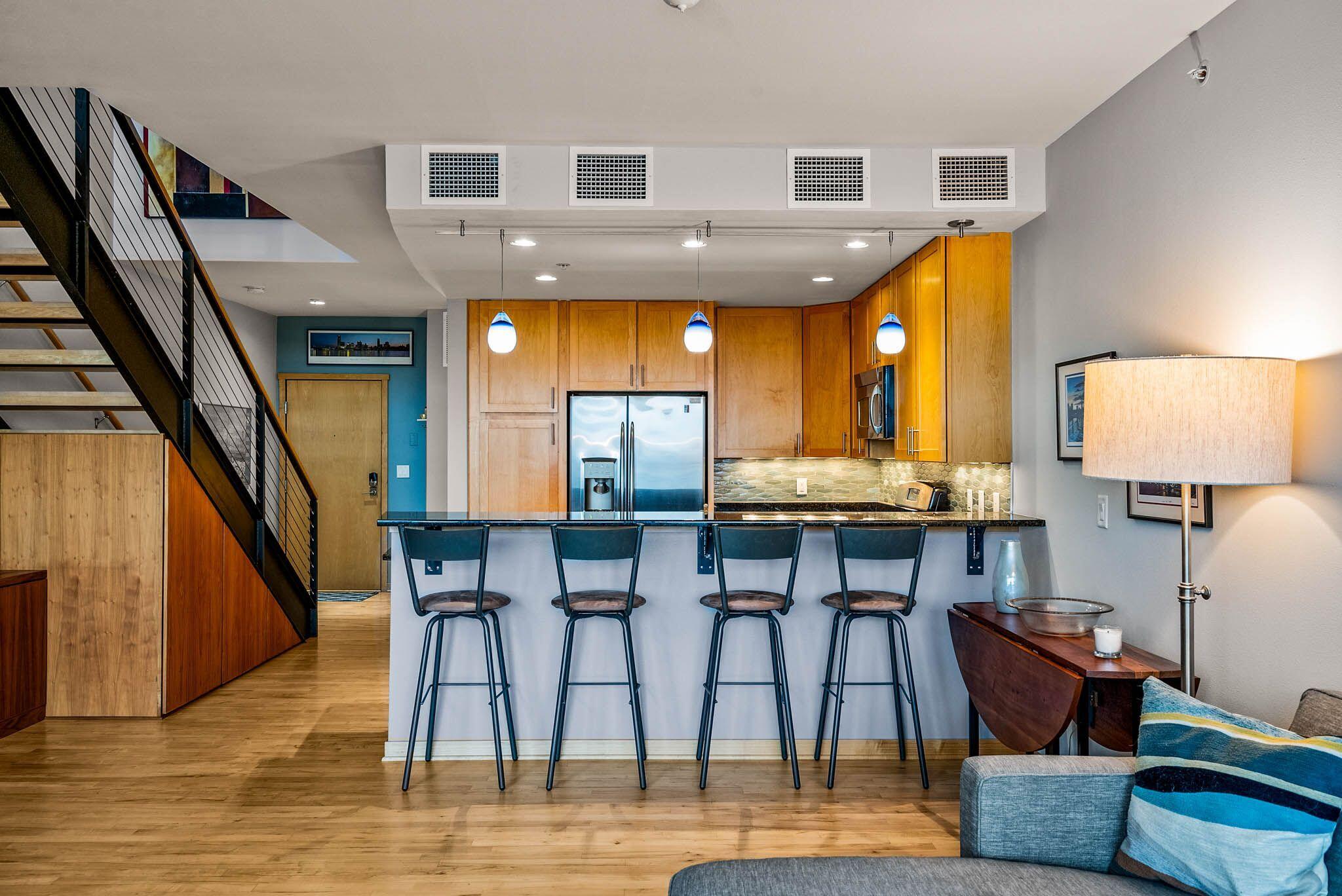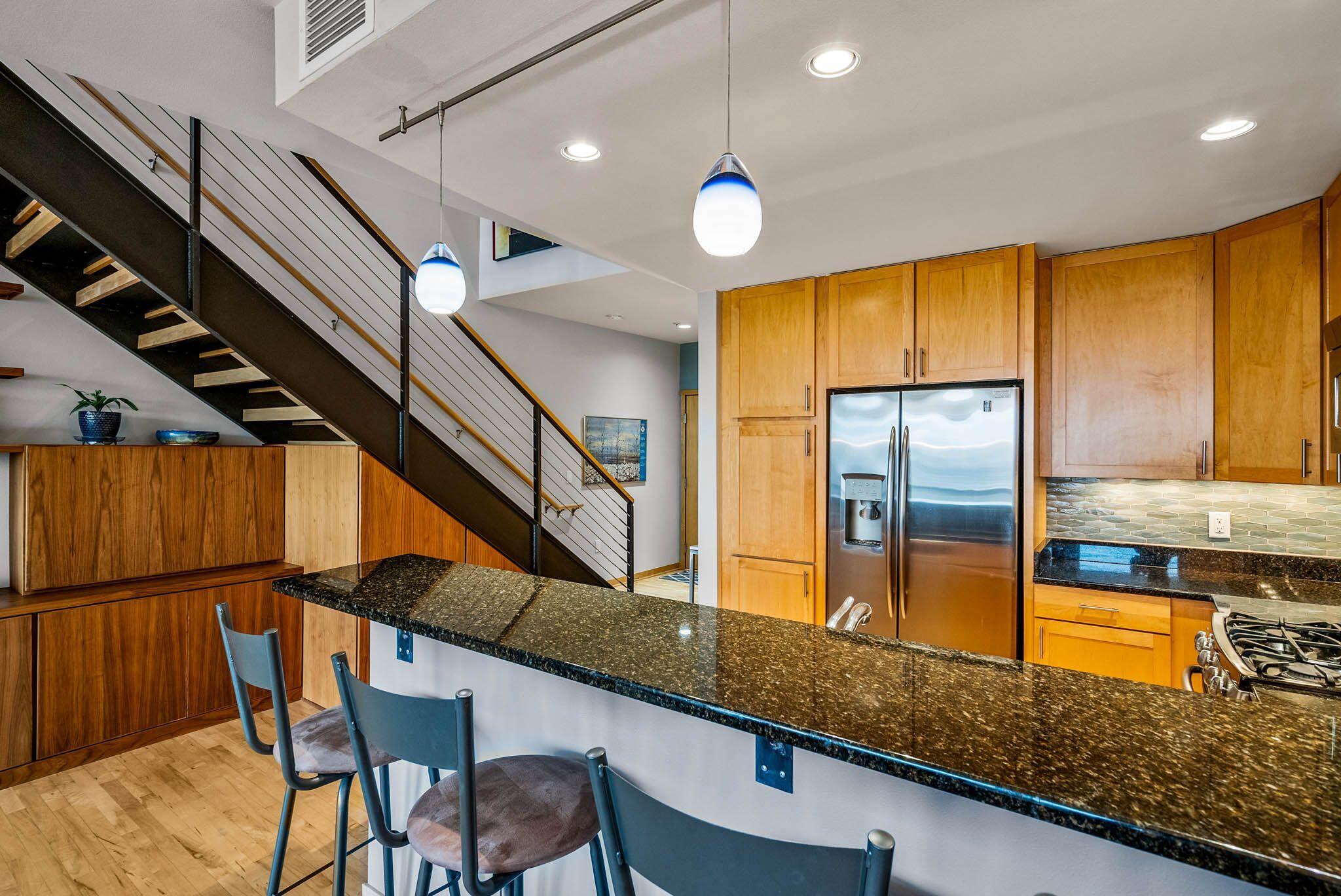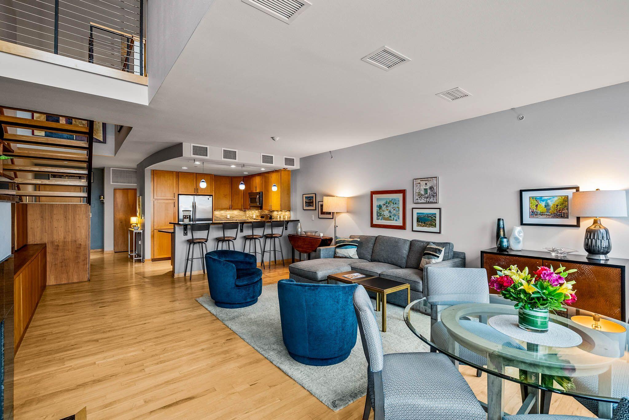 Third Ward living at its absolute best in this 2 story loft style unit at Marine Terminal Lofts. Owners have beautifully customized this sun drenched river facing unit and made it a perfect urban oasis. The great room with gas fireplace and gorgeous custom built-ins flows perfectly to kitchen with granite counters and dining space over looking the river. Enjoy the serenity of gorgeous sunsets as you grill out on your large deck with 2 gas lines for grill and fire pit. Take the open staircase to the second floor primary space with 2 closets and large bath with soaker tub and walk in shower. Excellent additional work from home space, reading a book, or just chilling and watching TV in the separate den with custom built-in shelves. All this plus 2 side by side parking spots!